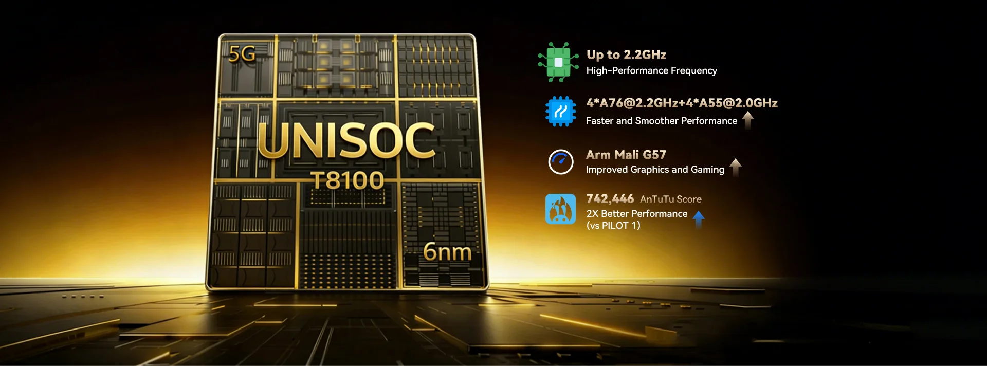 Kahdeksanytiminen 5G UNISOC T8100, 6nm, Jopa 2.2GHz