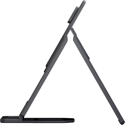 Az állvány teljesen körülöleli a képernyőt, védőtokként funkcionálva, miközben karcsú profilt és hordozófület biztosít a könnyű szállításhoz.